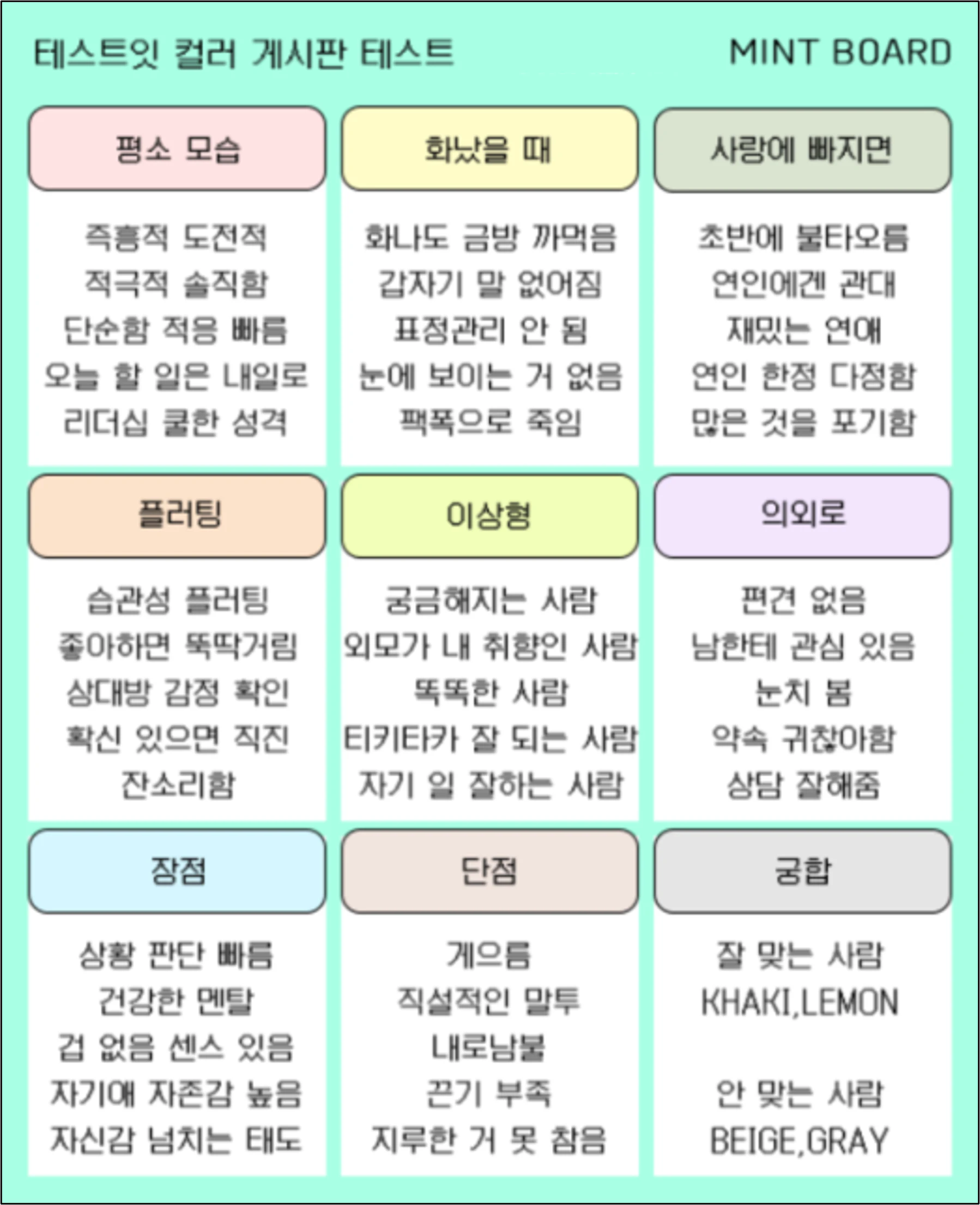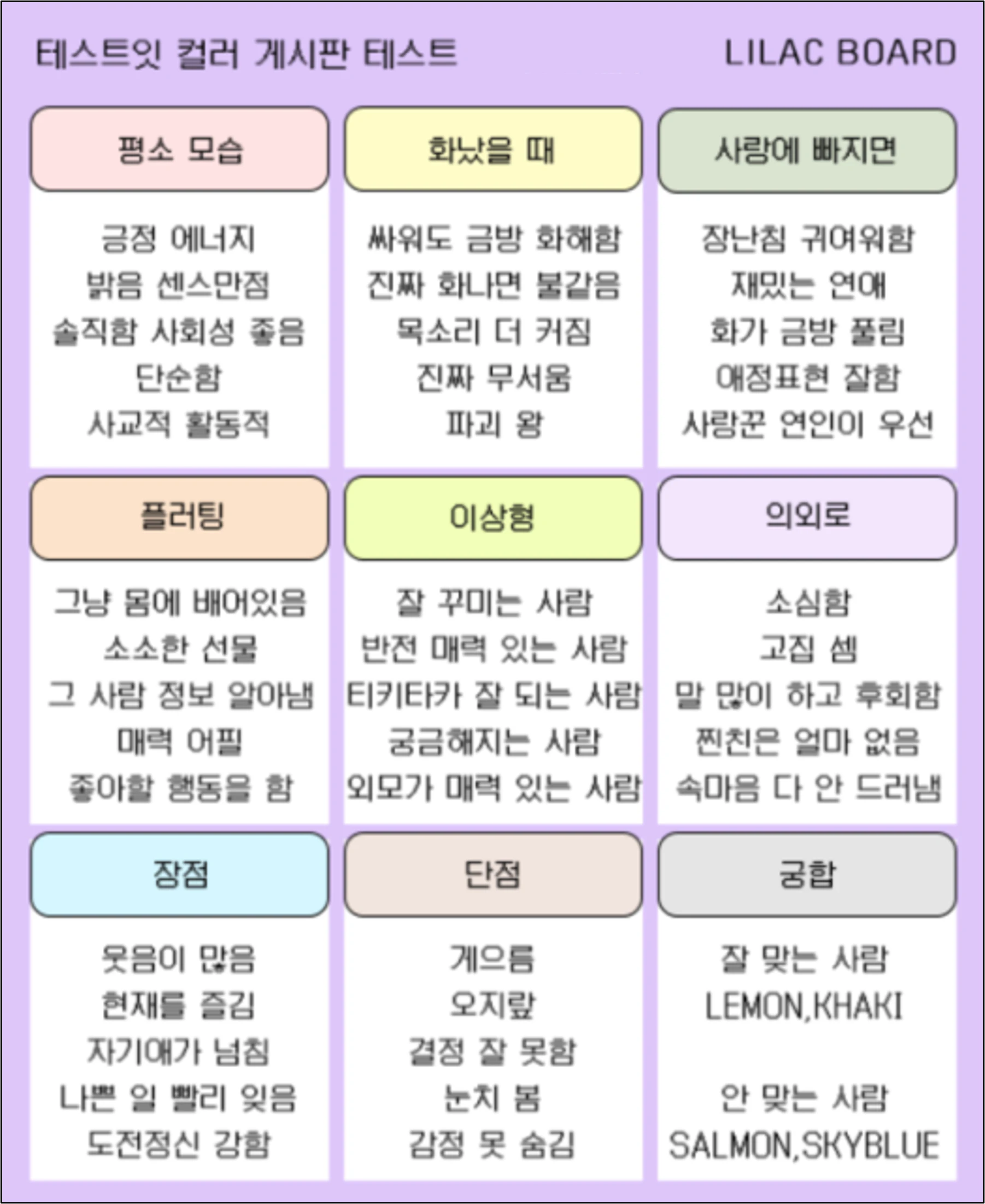 컬러 게시판 테스트를 안 해보신 분들은 아래 링크로 확인해 볼 수 있습니다. 맨 밑에 같이 보면 좋은 무빙 닮은꼴 테스트도 확인해 보세요.