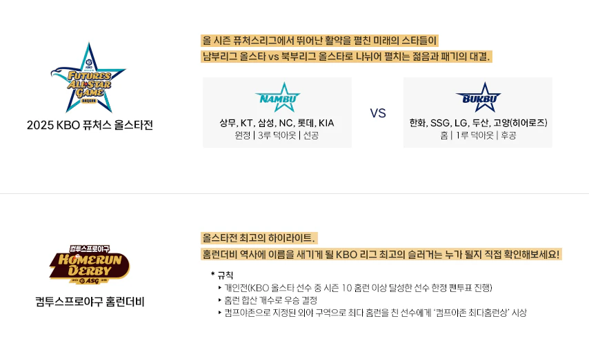 올스타전은 올스타 프라이데이와 본 게임으로 나뉘어 진행돼요. 퓨처스 올스타 게임과 홈런더비가 올스타 프라이데이에 열리고, 다음 날에는 팬사인회와 본 게임이 진행되죠. 퓨처스 올스타는 북부/남부 팀으로 나뉘어 진행되며, 입단 5년 차 이하 선수들에게 출전 자격이 주어져요.